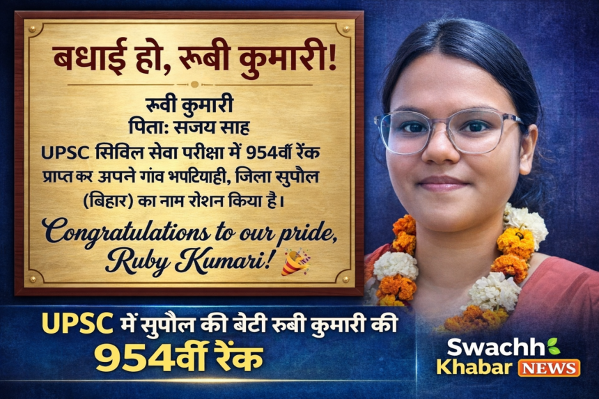 सुपौल की बेटी रूबी कुमारी ने UPSC सिविल सेवा परीक्षा में 954वीं रैंक हासिल कर जिले का नाम रोशन कर दिया है। भपटियाही की रहने वाली रूबी ने जैसे ही यह सफलता पाई, पूरा इलाका खुशी से झूम उठा। गांव, परिवार और रिश्तेदार—सभी के चेहरे खिल गए।